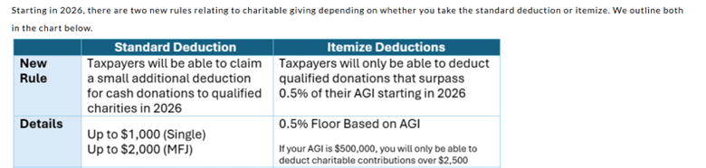 We highlight philanthropic giving in the next section as there are some new charitable provisions for 2026 tax year.