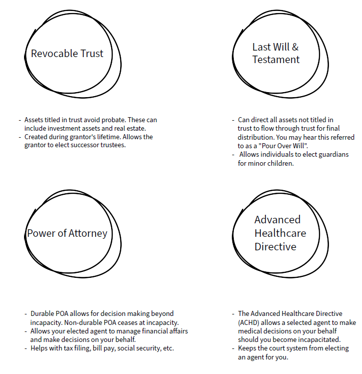 Building upon the direction of assets, there are four key estate plan documents that most adults should have, including: a revocable living trust, will, power of attorney (POA), and advanced health care directive (ACHD).